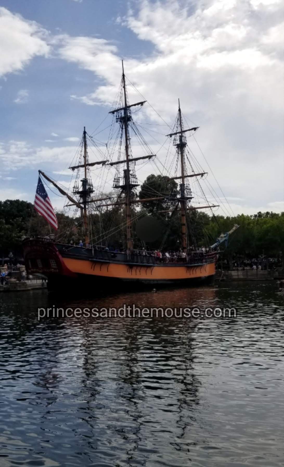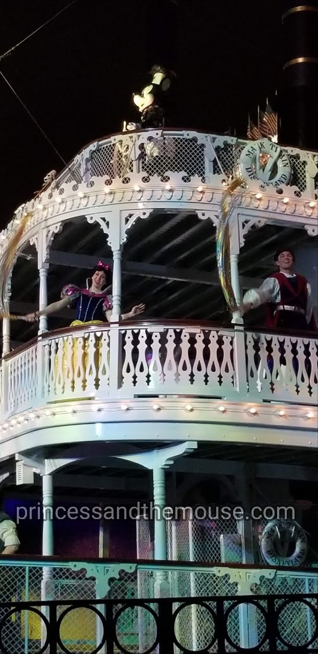 It was getting close to dinner time, we had dinner reservation for the Fantasmic Dinner package at the Riverbelle Terrace. So we made our way over to Frontierland. We still had plenty of time so we thought we would ride the Mark Twain Riverboat. However there was an issue on the river. The Columbia was stranded with guests on it. Well this was entertaining us so we sat along the water and watched as castmembers tried entertain guests on board the ship. They were eventually able to get The Coumbia back to the dock and get the people off the ship.