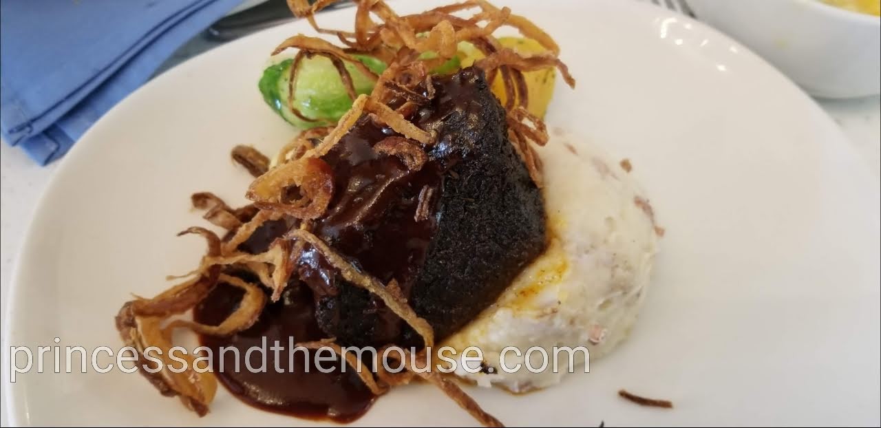 Eric and the boys met back up with us right before dinner. We went off the restaurant for dinner. The Fantasmic Dinner package was prepaid before our arrival. We had a prix fix menu. We were able to pick a corn chowder or salad as a starter. Then a entrée and then a choice of dessert. I had the salad, short rib and the maleficient dessert. The dinner package got us tickets to a reserved area to watch Fantasmic that night. We had our choice of the 1st or 2nd showing of Fantasmic. We chose the second showing.